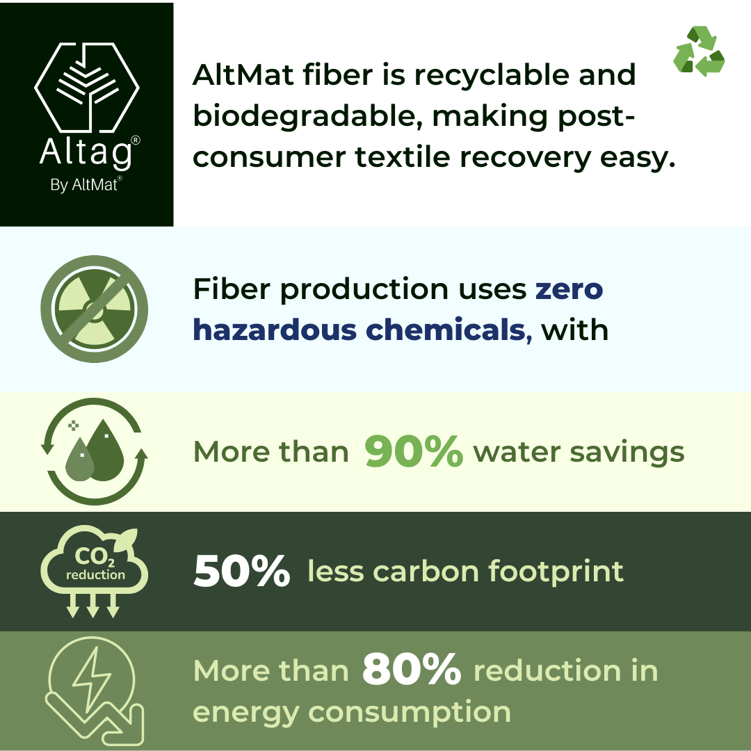 Fiber production uses zero hazardous chemicals, with more than 90% water savings, 50% less carbon footprint, and more than 80% reduction in energy consumption. AltMat fiber is recyclable and biodegradable, making post-consumer textile recovery easy.